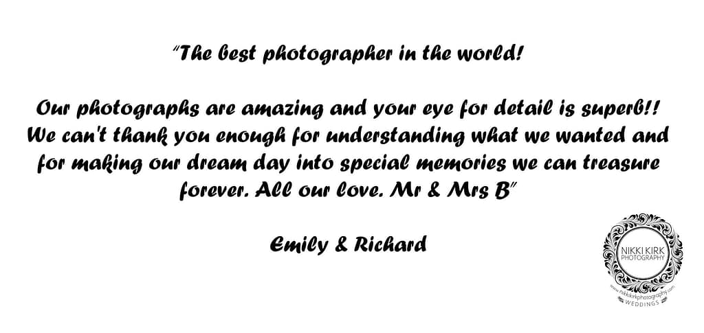 This also means that the photographs I take are unique to the couple even if I have been to a venue numerous times before. And if I haven’t been to a venue before I will always do a recce to ensure that this happens which also means that your photographs don’t drag on forever!