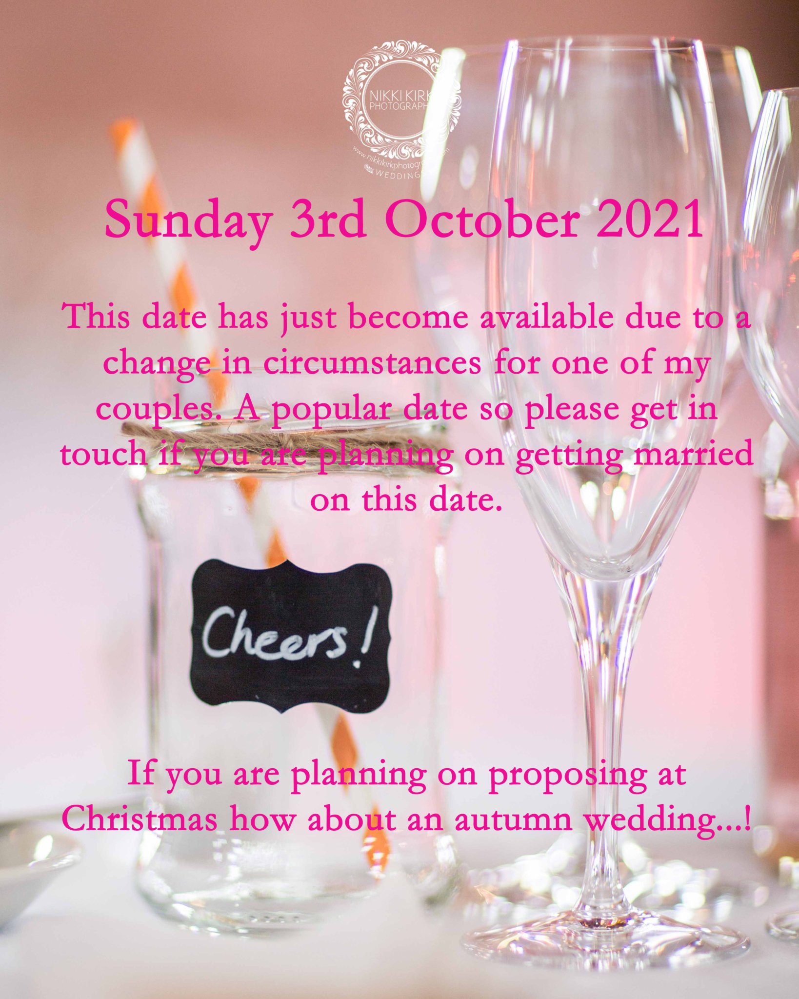 This date has just become available due to a change in circumstances for one of my couples. A popular date so please get in touch if you are planning on getting married on this date.
